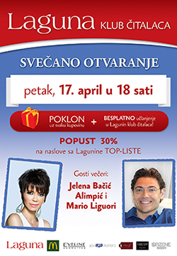 Čast da se zvanično najavi početak rada ove knjižare na novoj lokaciji pripala je Laguninim piscima Jeleni Bačić Alimpić i Mariju Liguoriju koji će tom prilikom potpisivati svoje knjige.