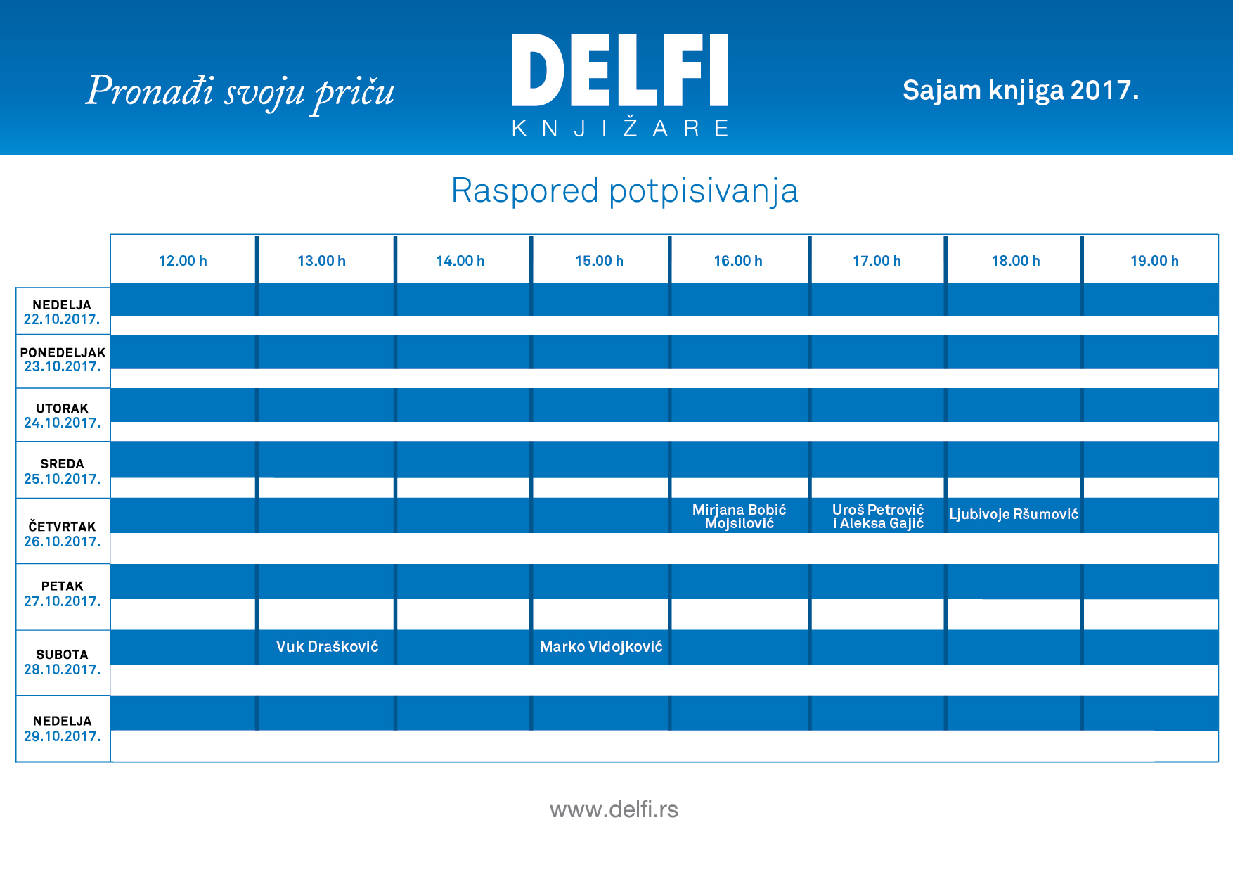 Satnicu gostovanja autora na štandu knjižara Delfi u Hali 4 naći ćete OVDE.