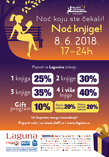 Narodna biblioteka Srbije od 11. do 13. juna odobrava popust od 30 odsto na sve članarine uz priložen račun o kupovini u knjižarama Delfi tokom Noći knjige, 8. juna 2018.